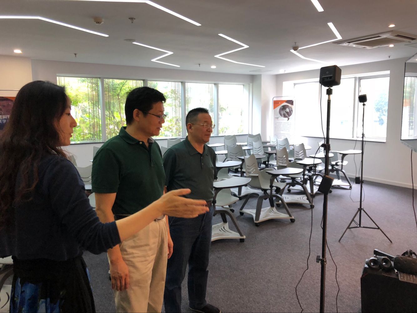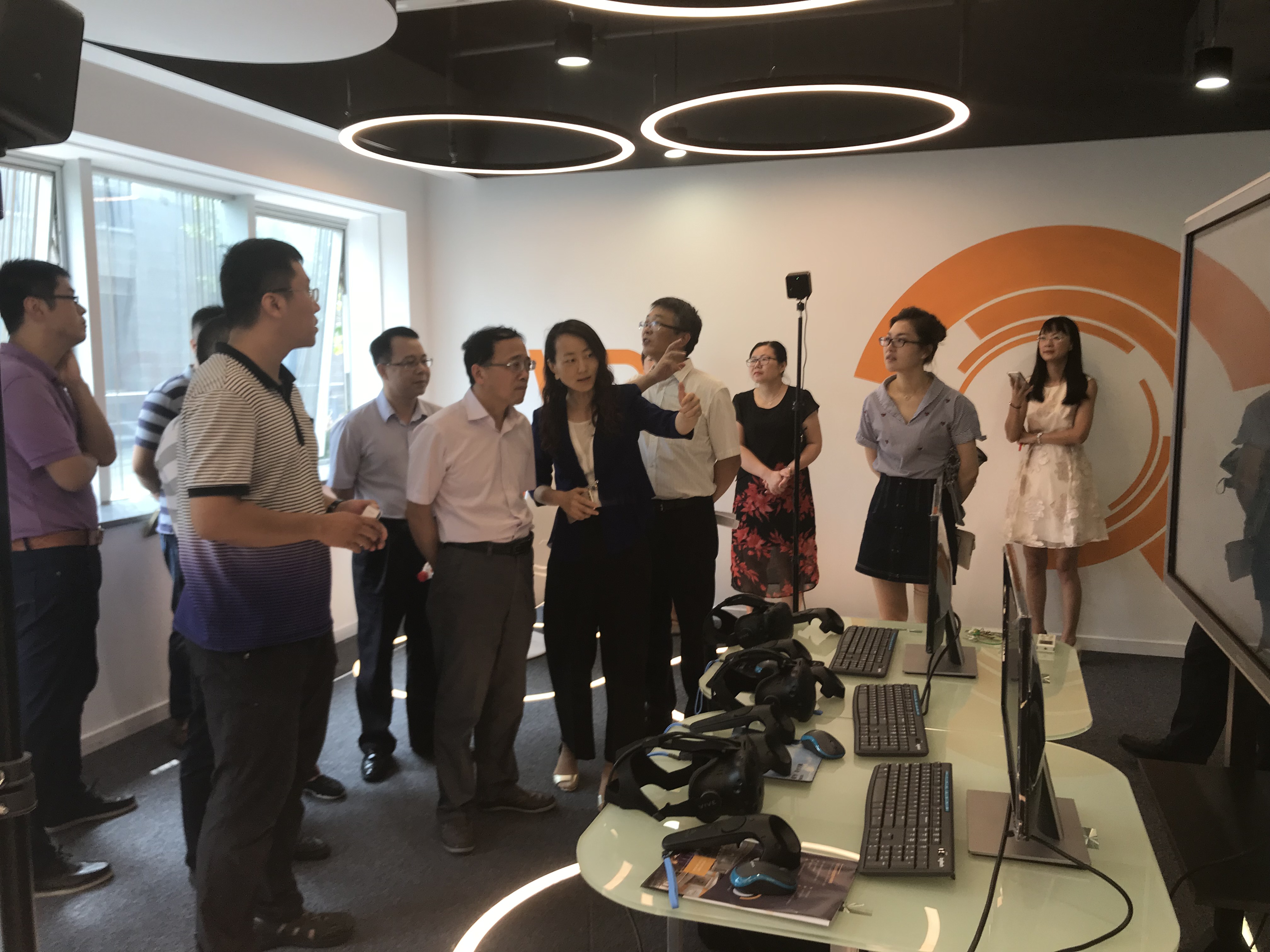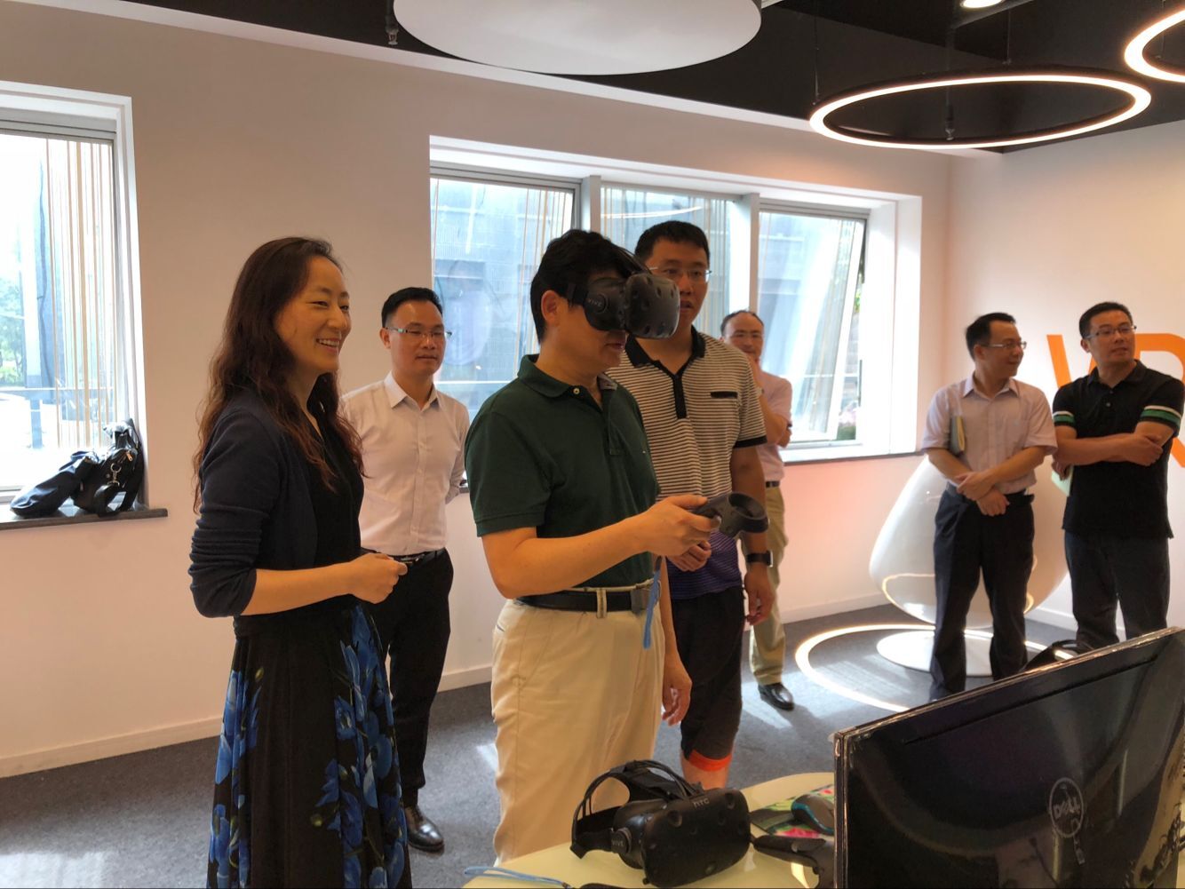 我院李颖副院长向王书记、杨校长汇报了我院虚拟现实外语实训中心建设的成效,并展示了相关设备的使用运行情况。她说,杭州师范大学外国语学院2017年9月开建虚拟现实外语实训中心,它的建成极大地延伸了师生的学习与实训空间,尤其是外语演讲教学与实训方面尚属全国高校外语界首创。学院计划结合教学活动和学科建设,以实验室为依托,充分发挥实验室服务教学、服务研究和服务社会的功能,鼓励全院教师充分利用好学院实验室及其资源平台创新教学模式。学校两位领导莅临学院检视,显示了学校对该中心的重视和关心,该中心的成立及发展对我院迎接教育部本科教学审核评估有着重要的推进作用,同时该中心也是我院跨境电商实训基地,对于促进商务英语专业建设起到了积极的作用。
