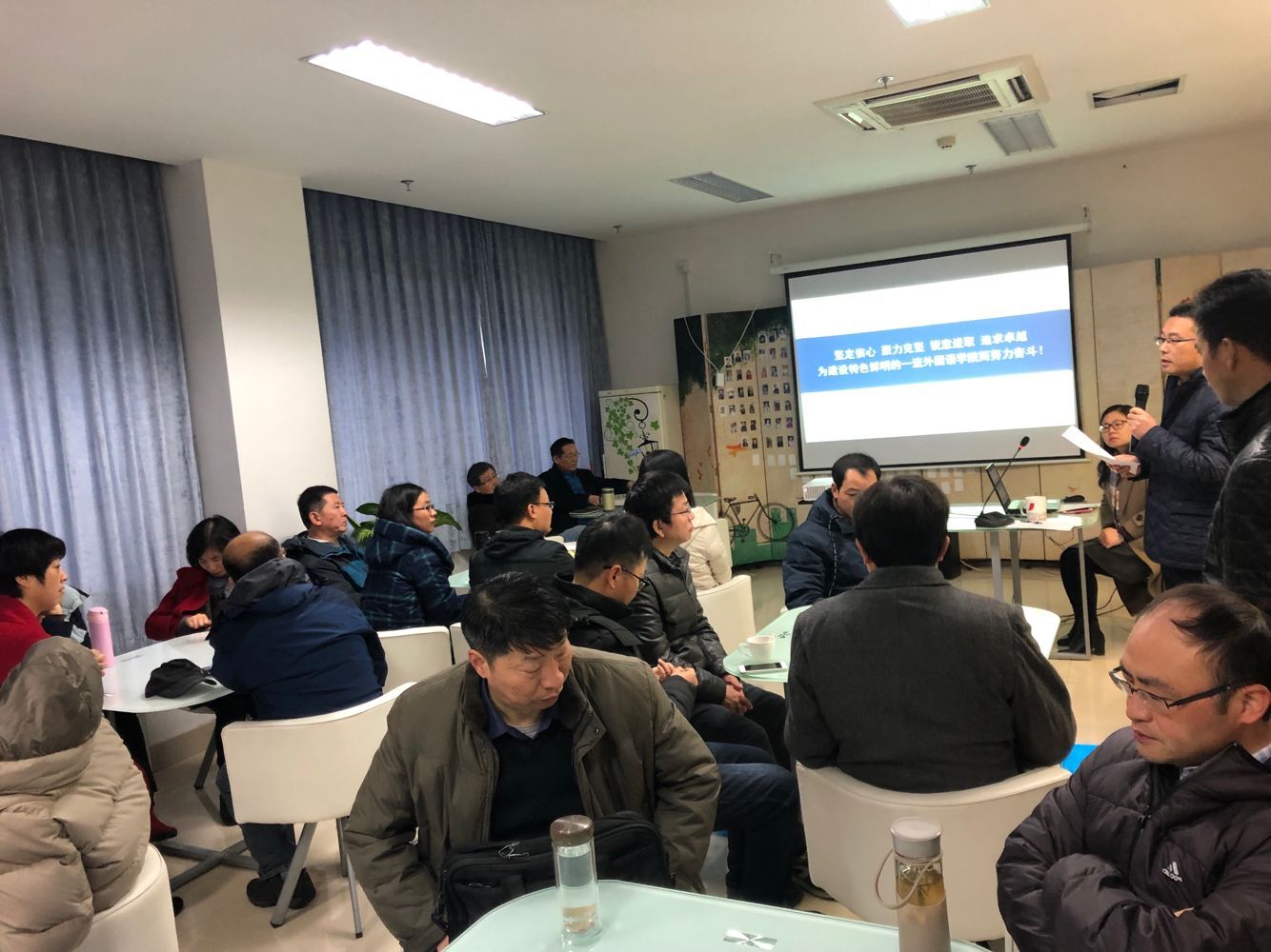 2018年12月16日,我院在恕园19号楼104教工之家召开外国语学院第五届教代会、工代会第六次会议。会议由学院党委副书记金岳祥主持,院长欧荣做了2018年度学院工作报告,学院党委书记任顺元做重要讲话。