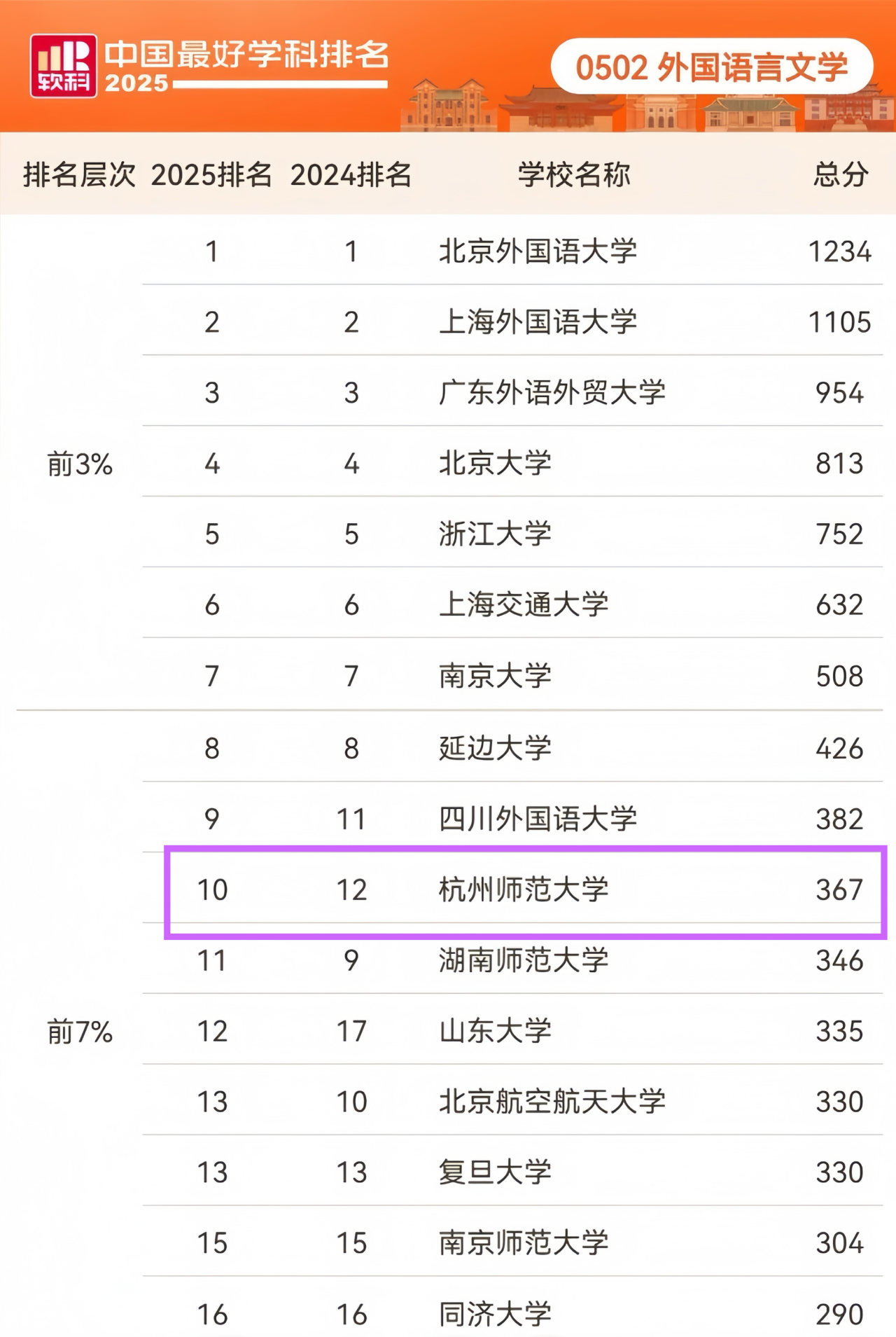 这些高水平的师资队伍和科研成果为我院外国语言文学学科的软科排名奠定了坚实的基础,也扩大了我院在全国的知名度和美誉度。接下来,我院将向国内一流外语学科看齐,落实立德树人根本任务,服务国家战略和改革开放大局,为浙江及杭州的国际化建设提供智力支撑。