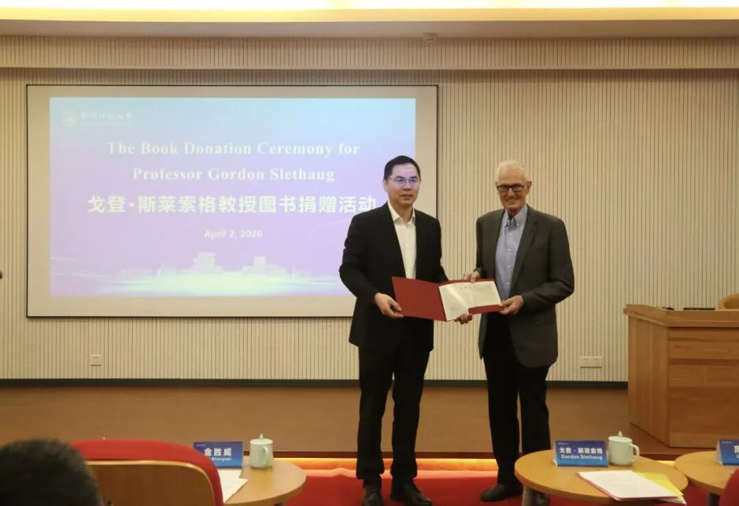 金胜威向斯莱索格教授致谢并颁发捐赠证书。他表示,此次捐赠不仅进一步丰富了学校馆藏资源,也将为师生拓展学术视野、深化教学科研提供有力支撑,成为学校推进学科建设与国际人文交流的宝贵财富。