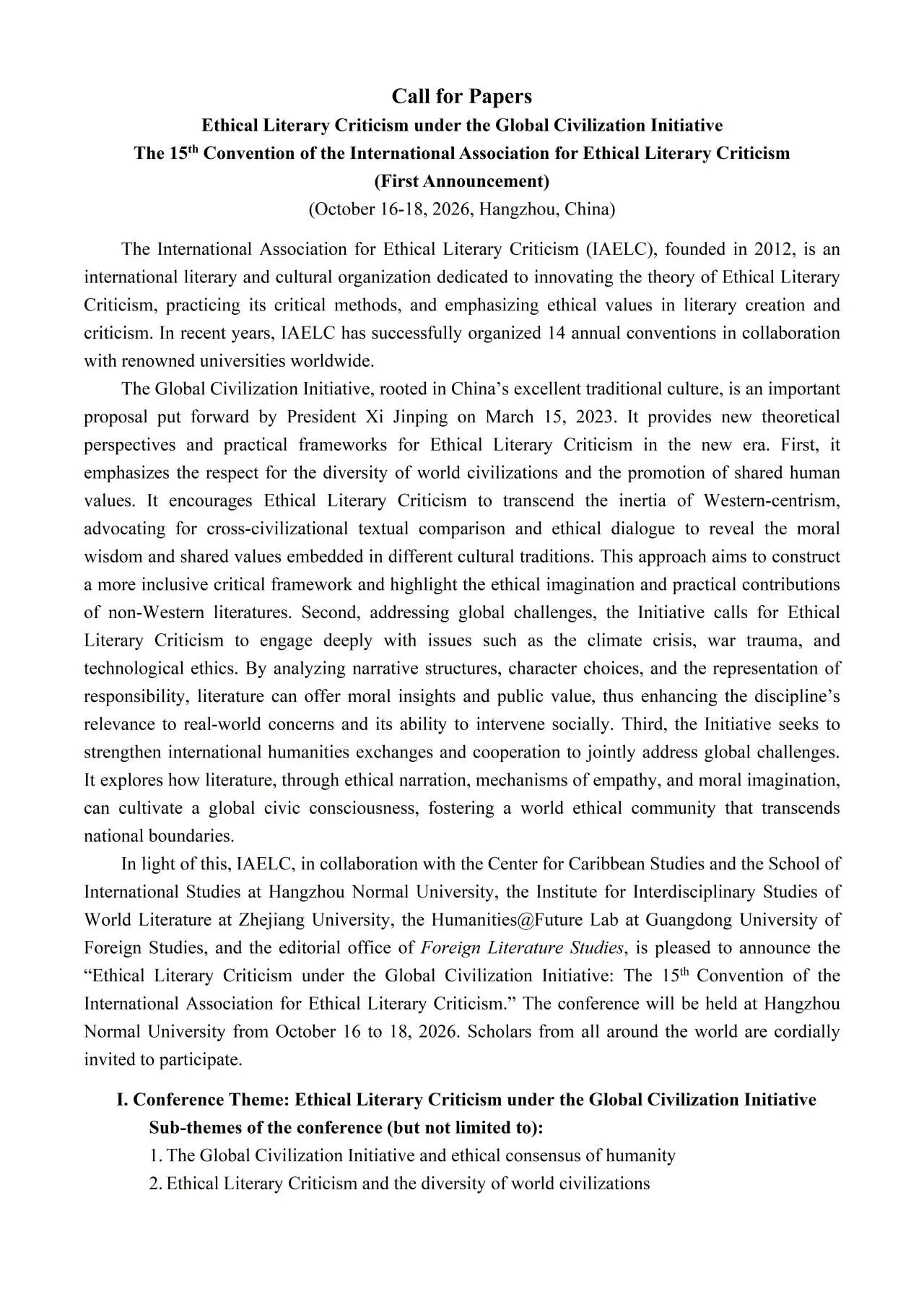 会议通知 || 全球文明倡议下的文学伦理学批评:第十五届国际文学伦理学批评研究会年会(第一号通知)